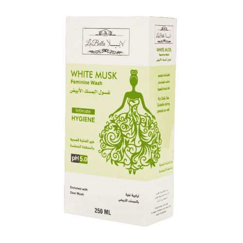 دللي نفسك بعناية راقية مع غسول المسك الأبيض للمنطقة الحميمية من لابيلا – 250 مل، المصمم خصيصًا لتنظيف لطيف ومنعش مع الحفاظ على التوازن الطبيعي للبشرة الحساسة.